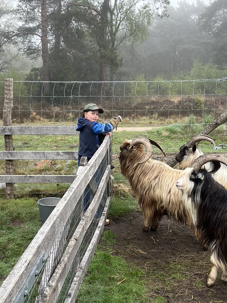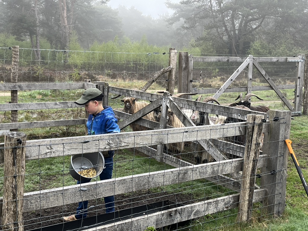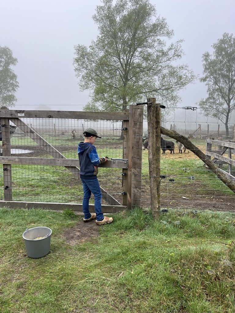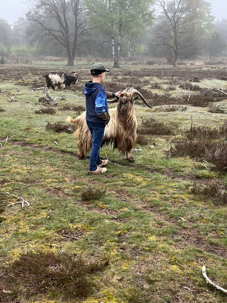 ‘Je kan er je IPhone op gelijk zetten’. Iedere zaterdagochtend, stipt om 08.30 hoor ik de klik van het kleine hekje, slaan de honden aan en rennen naar Chris toe. Die helpt me al 3 jaar iedere zaterdagochtend met het voeren van de bokken. Hij haalt het voer uit de stal en samen lopen we naar de hei. Tijdens de wandeling nemen we de week door. Wat er is gebeurd op school, met ‘grootvoet’ de eend, het vervelende slijten van klompen en andere belangrijke dingen. Bij de bokken aangekomen verlaagd Chris de nachtstroom, naar de dagstroom, doet het hek open, loopt tussen de bokken waarvan de horens boven hem uitkomen, naar de vangkraal. Daar verdeeld ie het voer, duwt het hek open, telt de dieren of ze er allemaal zijn en kijkt tevreden als ze hun dagelijkse kleine portie brok opeten. Hij controleert het water, zwaait het hek naar de hei open en wacht tot de dieren klaar zijn. Terug naar huis praten we verder. Nog wat spelen met de honden, kijken of de eenden in het Hessenmeer zitten en dan fietsen we samen naar zijn huis. Niet meer nodig, maar een ‘ingesleten’ gewoonte. Hij weet nog niet wat hij wil worden; timmerman, jager, bokkenboer of alle drie. De tijd zal het leren.
