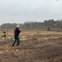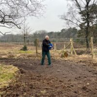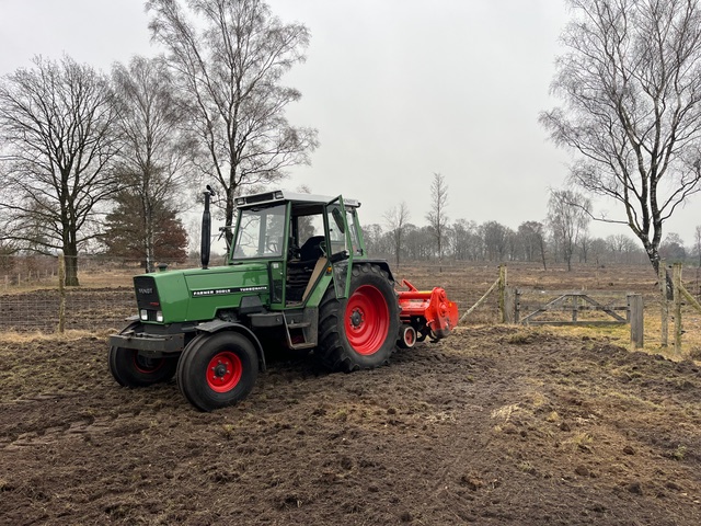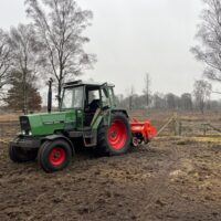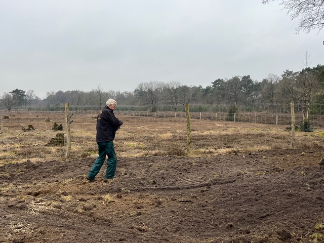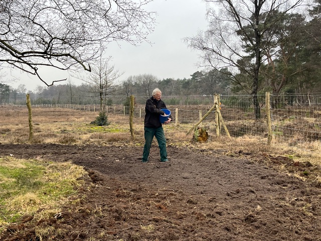 Deze week was een trekker van loonbedrijf Van den Hardenberg uit Elspeet in het verlengde van het Speulderveld, de eerste bokken kraal en een stuk daarbuiten aan het omwerken. De bedoeling is om hier, net als in een oude tijde, een heideakker te maken van onder andere rogge maar ook wilde bloemen. Oudgediende Bram zag tijdens het bewerken van land, dat een zaaimachine hier geen enkele zin had en alleen maar kapot kon gaan en gebruikte z’n oude kennis en zaaide uiteindelijk ‘handmatig’.