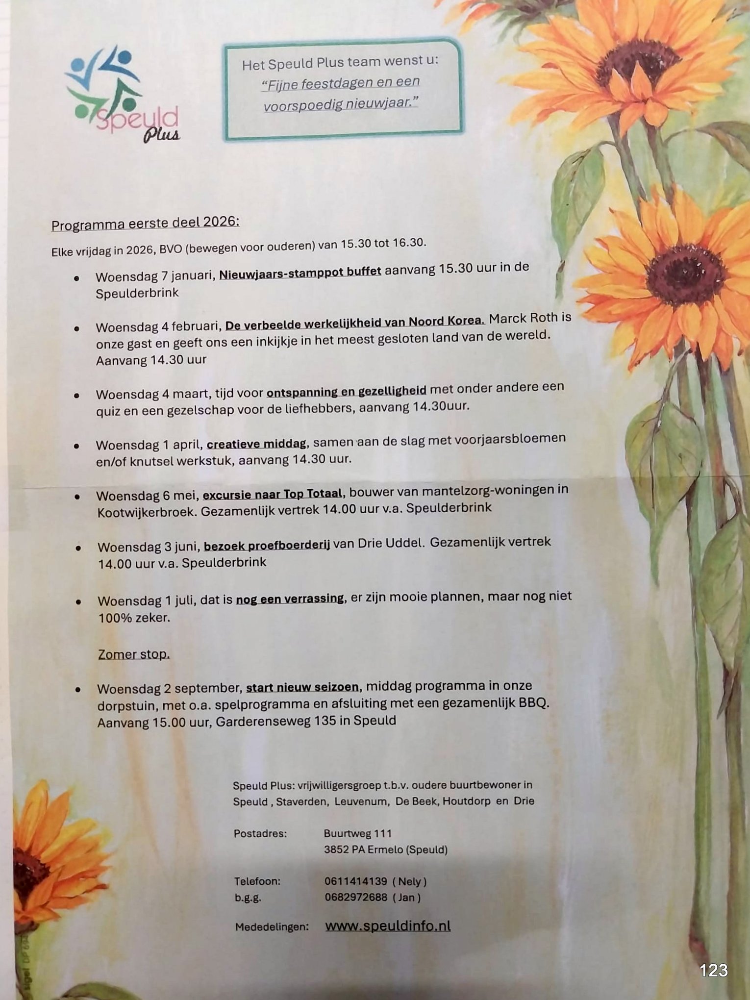 Vanaf deze plaats willen we u allen een heel gezond en voorspoedig 2026 wensen. A.s. woensdag gaan we weer beginnen met een gezellig en heerlijk stamppot buffet. Dat valt meestal wel in de smaak.