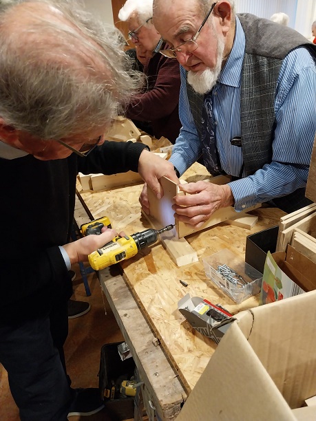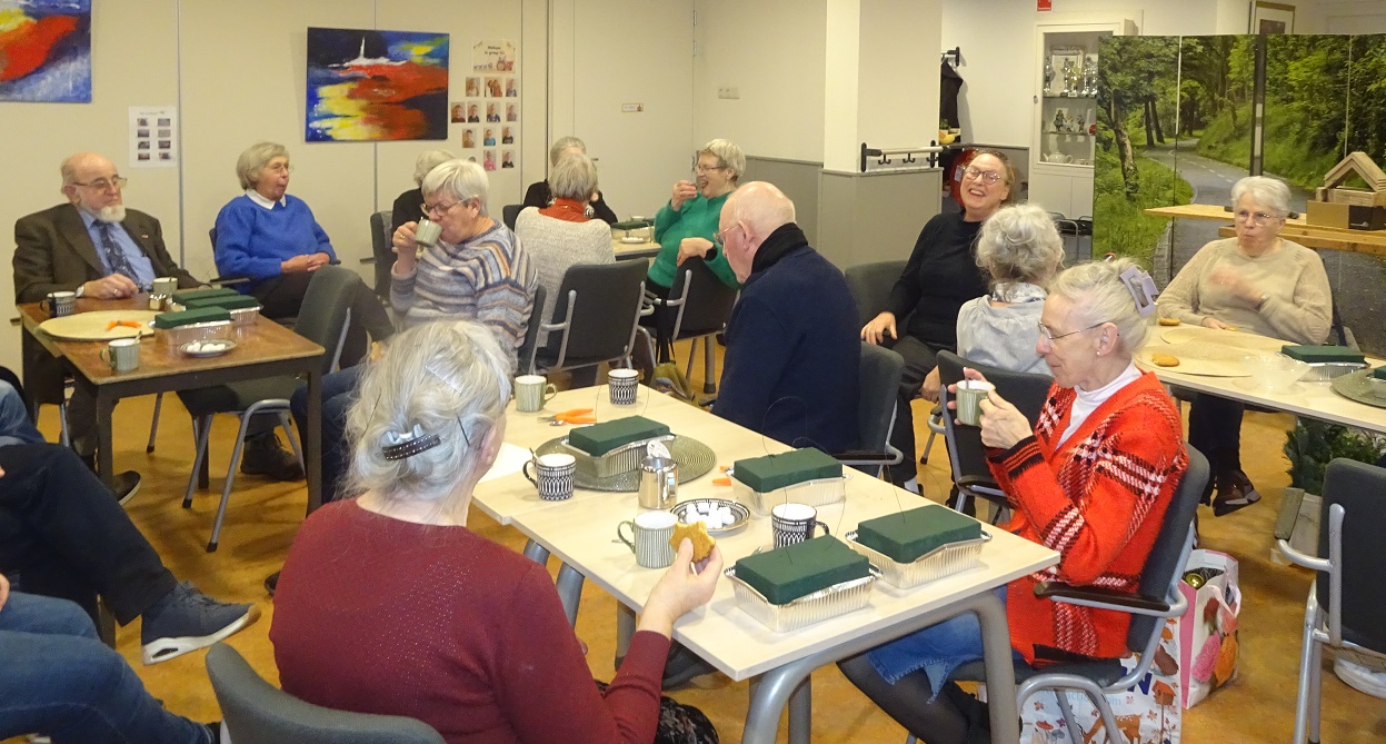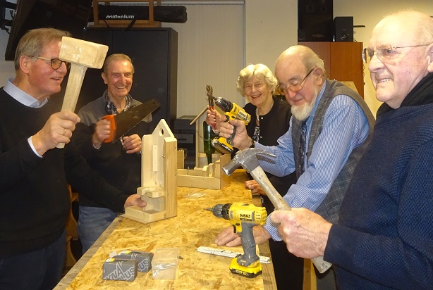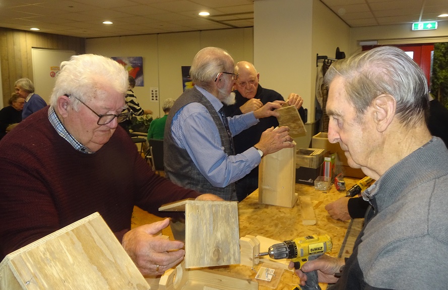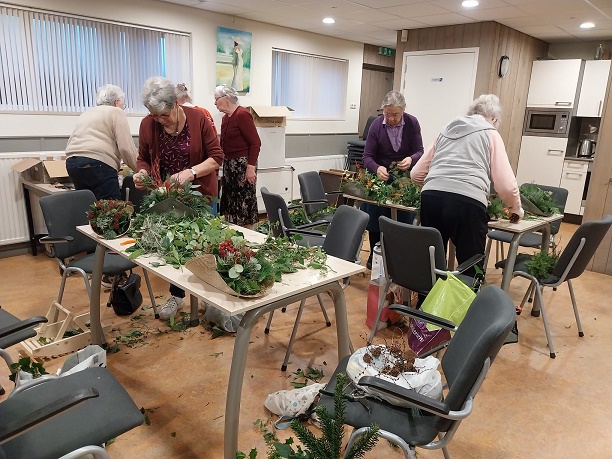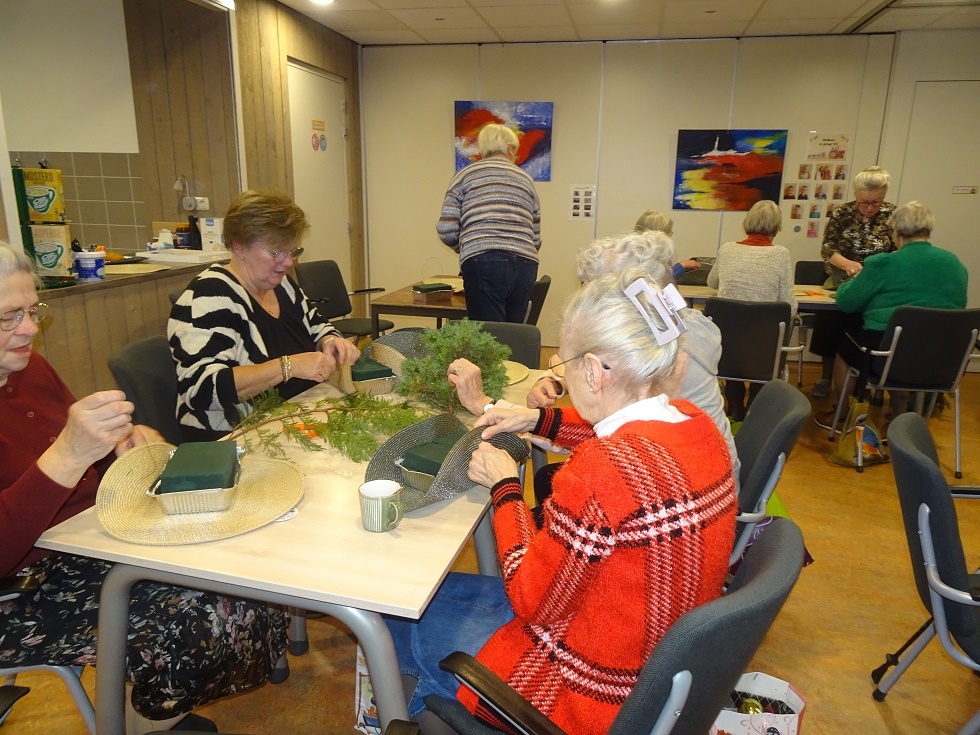 Op 3 december was het een bijzonder actieve Speuld Plus middag. Na de koffie en iets lekkers kwamen de aanwezigen in actie. Al zijn de deelnemers niet meer zo piep jong, er wordt wel ijverig gewerkt als het nodig is. Onder leiding van Dicky werden er bijzonder mooie kerkststukken gemaakt. Met zulke prachtige decoraties op tafel komt gelijk de decembersfeer in huis. Omdat we ook de vogels rondom onze huizen de winter door moeten helpen werden er ook een hele reeks wijnfles-vogelvoer-huisjes in elkaar geschroefd door de mannen. Je kon zien dat ieder zicht wel kon vermaken op deze middag, het was een gezellige drukte. De zaal was uiteindelijk wel een rommeltje, maar vele handen maakten ligt werk, het opruimen was ook zo gepiept. Een geweldig leuke middag.