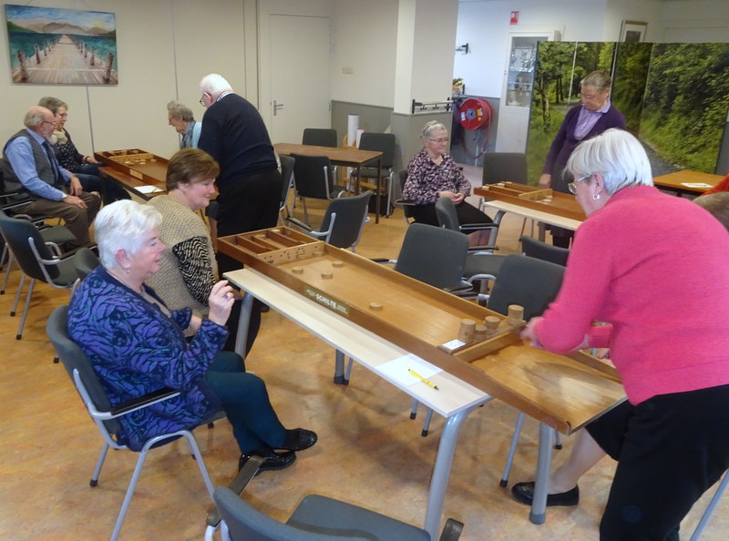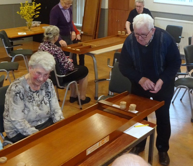 van genoten. Daarna kwam het zware werk. Want hard werken dat was het. Meerder rondjes sjoelen in verschillende bakken en dan in groepjes van 5. De spanning liep soms hoog op, maar het was ook ontspanning en zeker heel gezellig. Winnaar in deze strijd was Cornelis Stip. Het was weer een geweldig mooie middag voor alle aanwezigen.